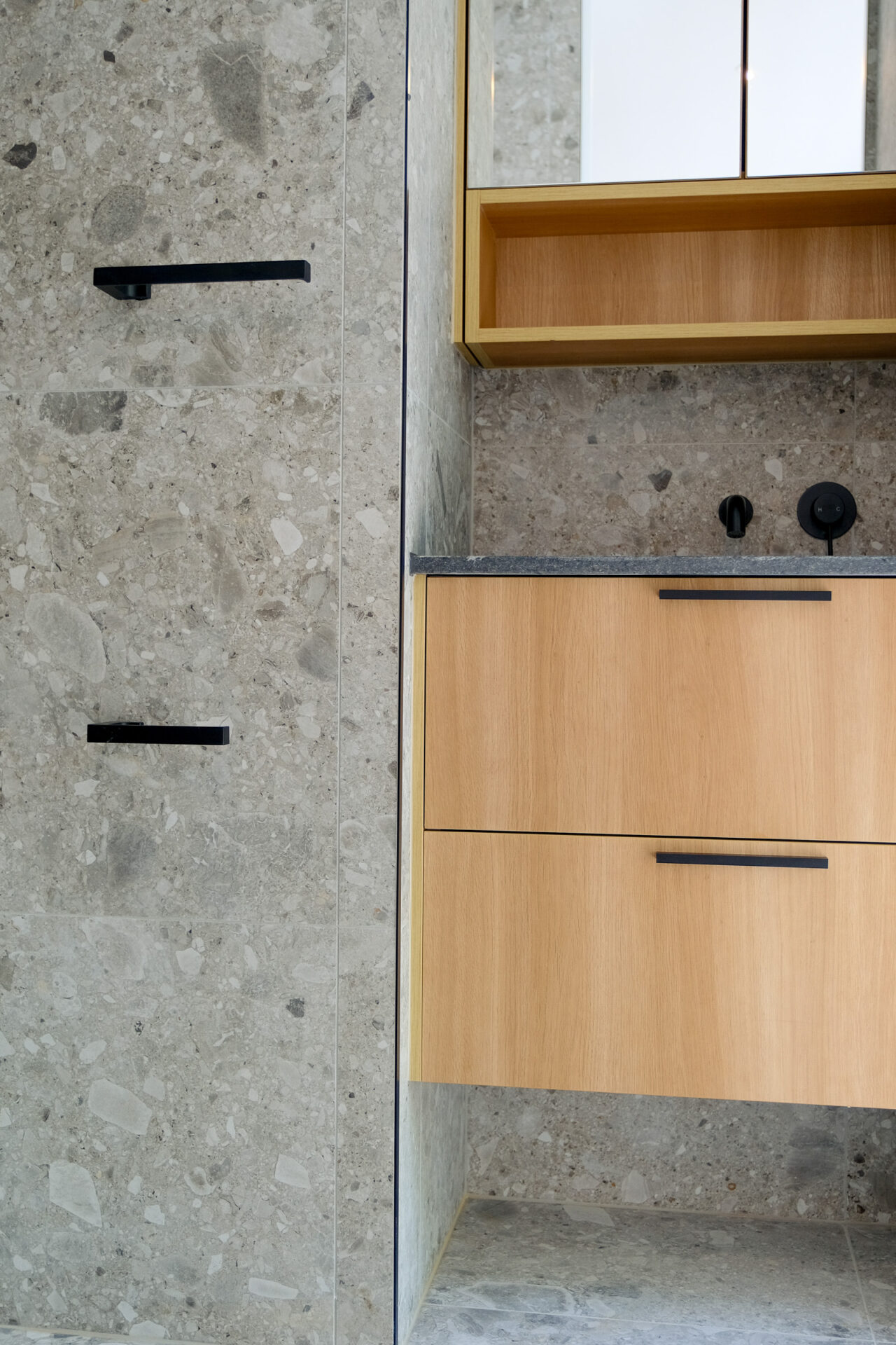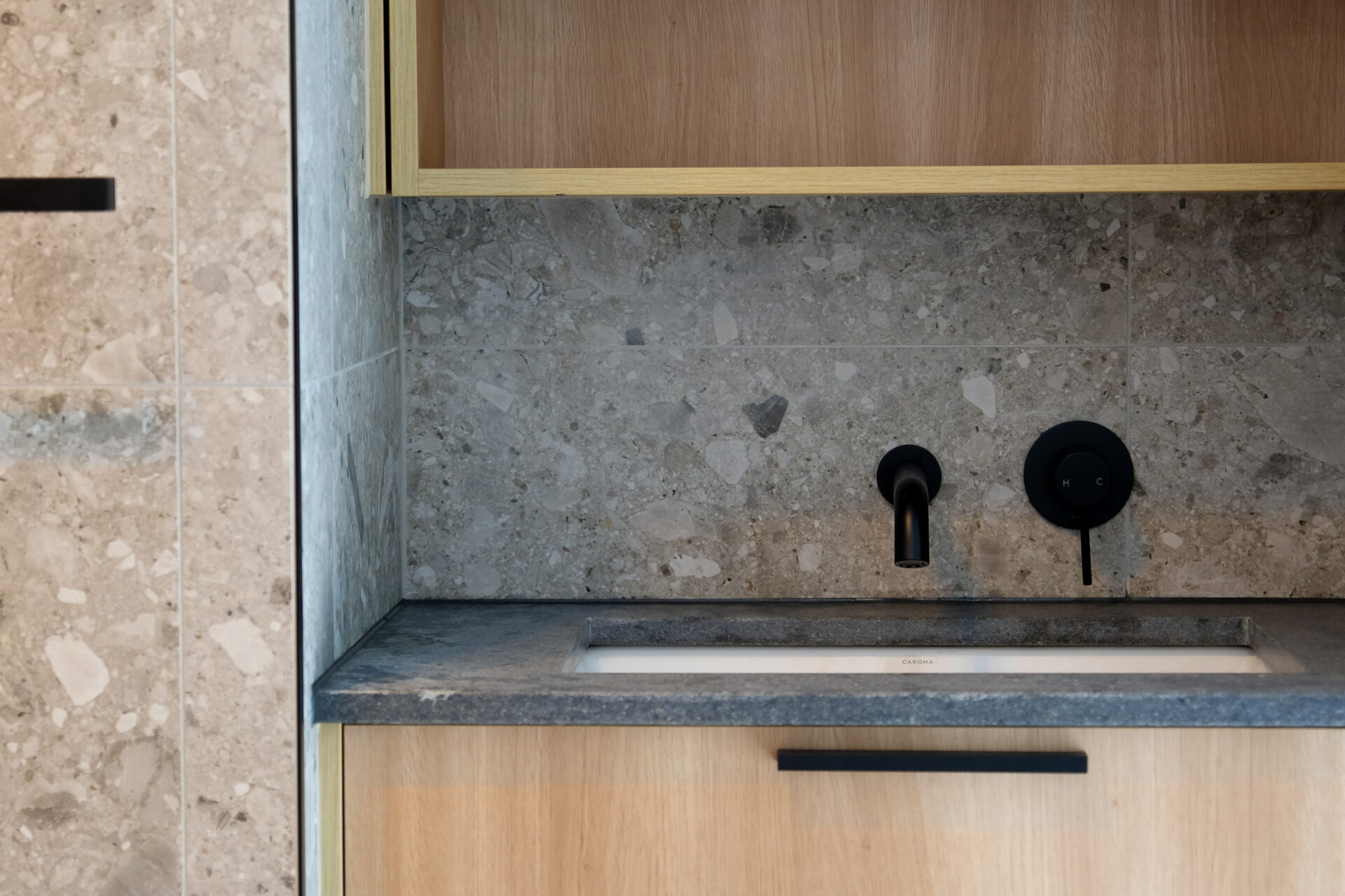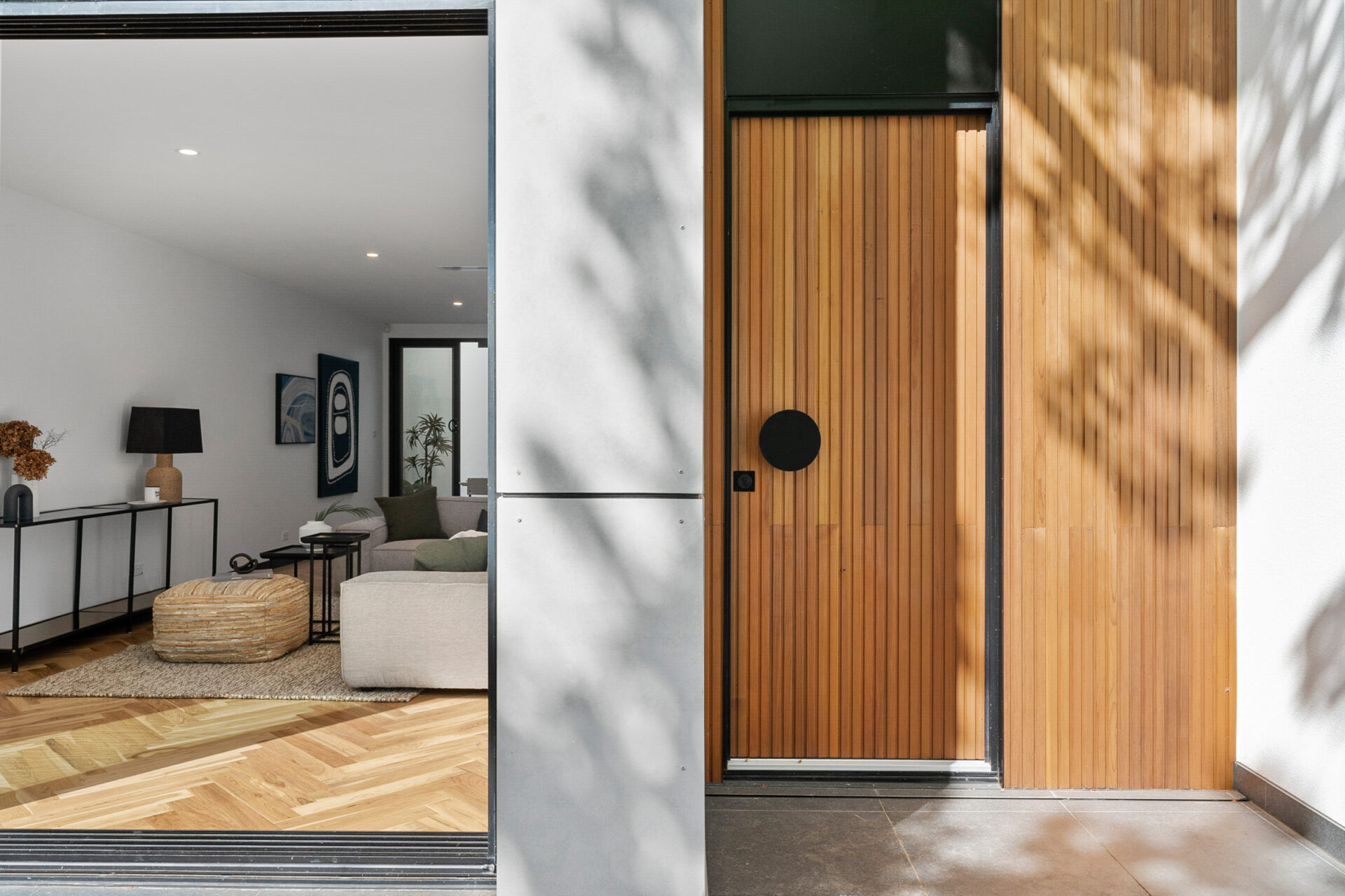 The exterior material palette is simple yet refined, the sum of its parts purposely coordinated to define the entrances to each townhouse to ultimately provide presence.